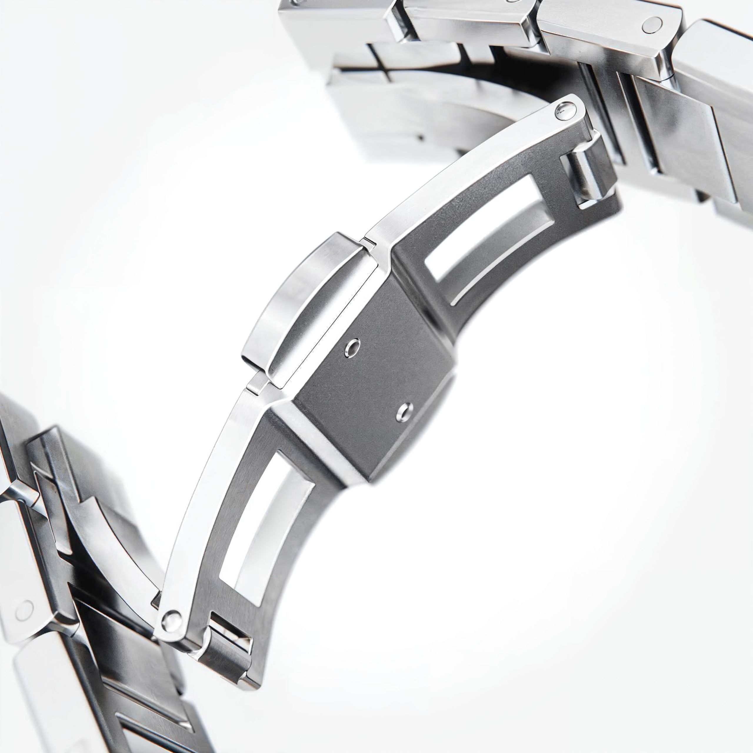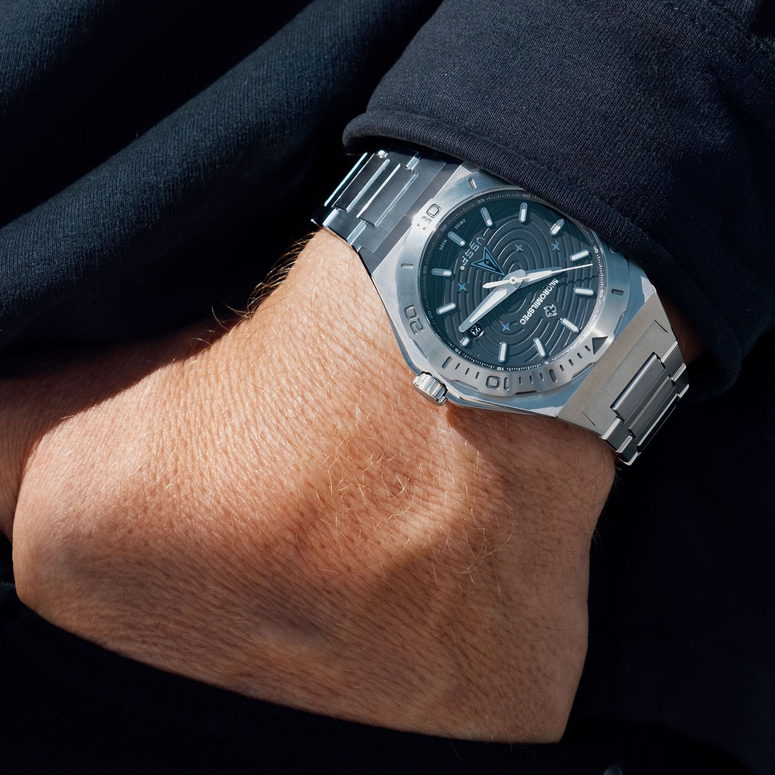 Matte black dial with the Space Force Delta, stars and orbits. Enclosed in a satin brushed stainless steel case, integrated straps, chamfered crown guard, screw in crown and sapphire crystal.