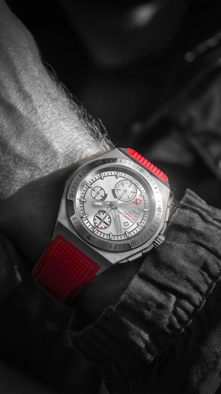 The T5 features an eye-catching red-tipped GMT hand and is powered by the La Joux Perret L121 movement, offering a 60-hour power reserve. The dial's high legibility and the rotating bezel with a minute scale add to its practicality. Water resistant up to 200 meters and produced in a limited annual run of 35 pieces in two variants. Made from Grade 5 titanium, ensuringlightweight comfort and tactical aesthetic. It comes with a choice of a titanium bracelet or rubber strap, complementing its red and satin finish.