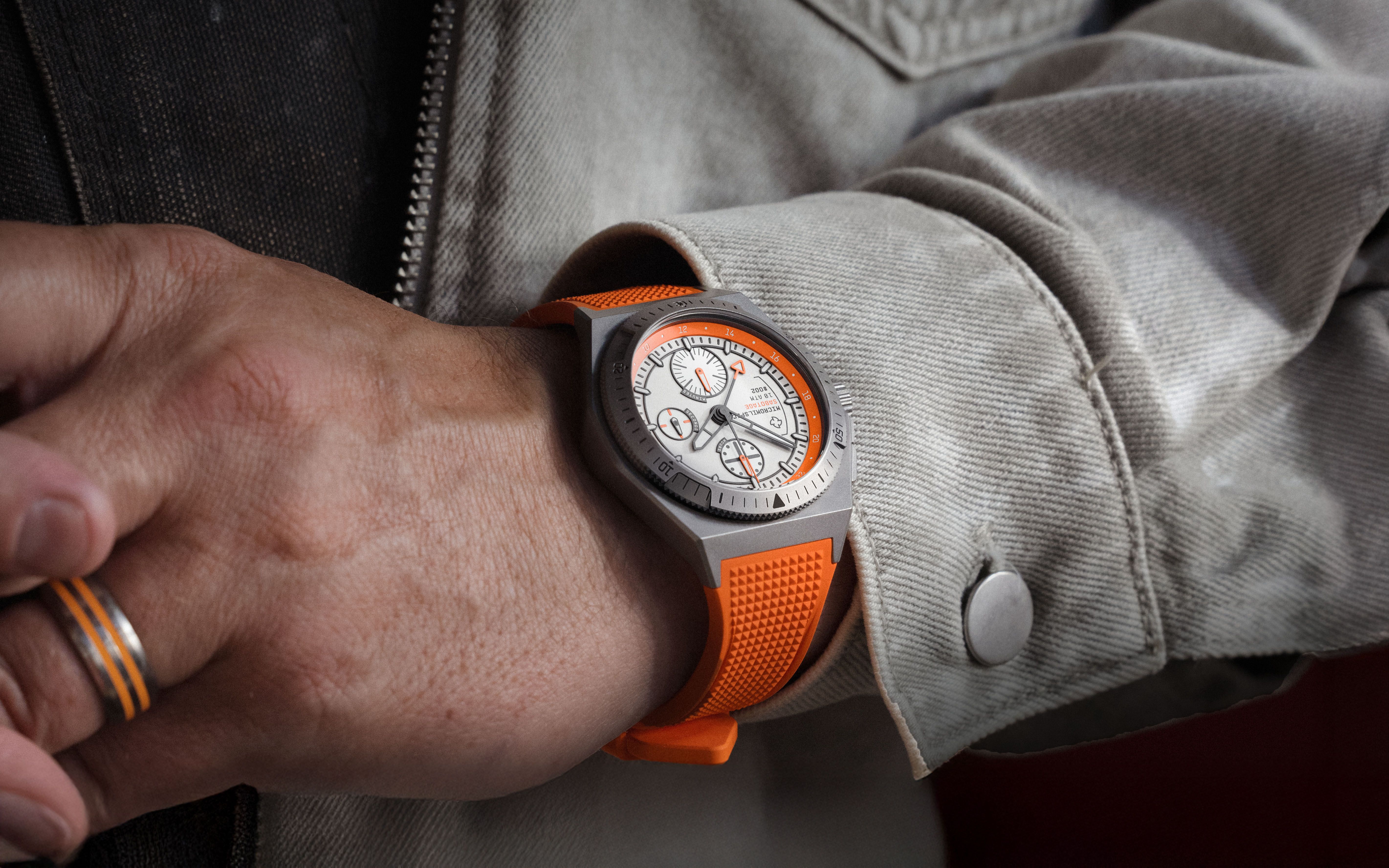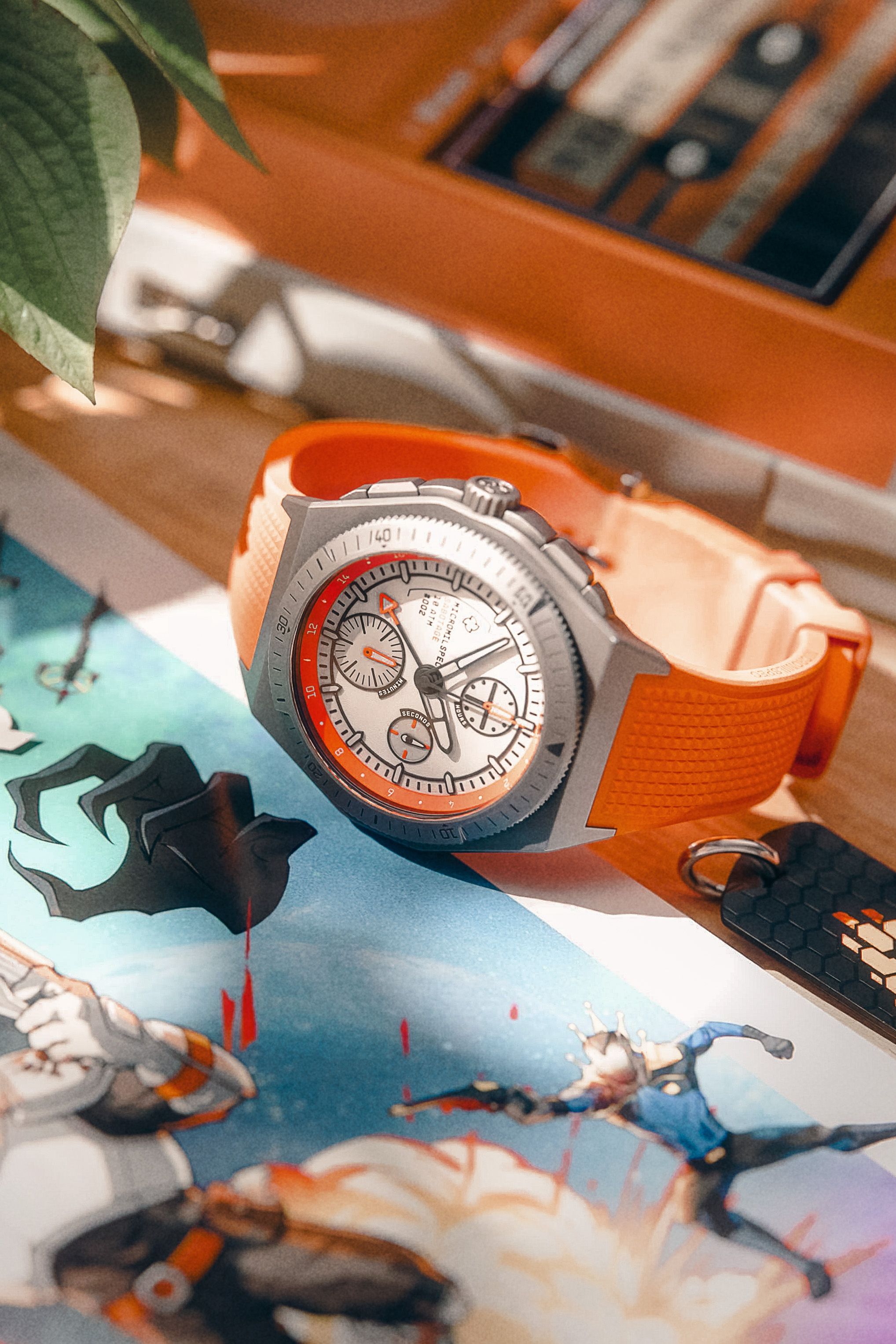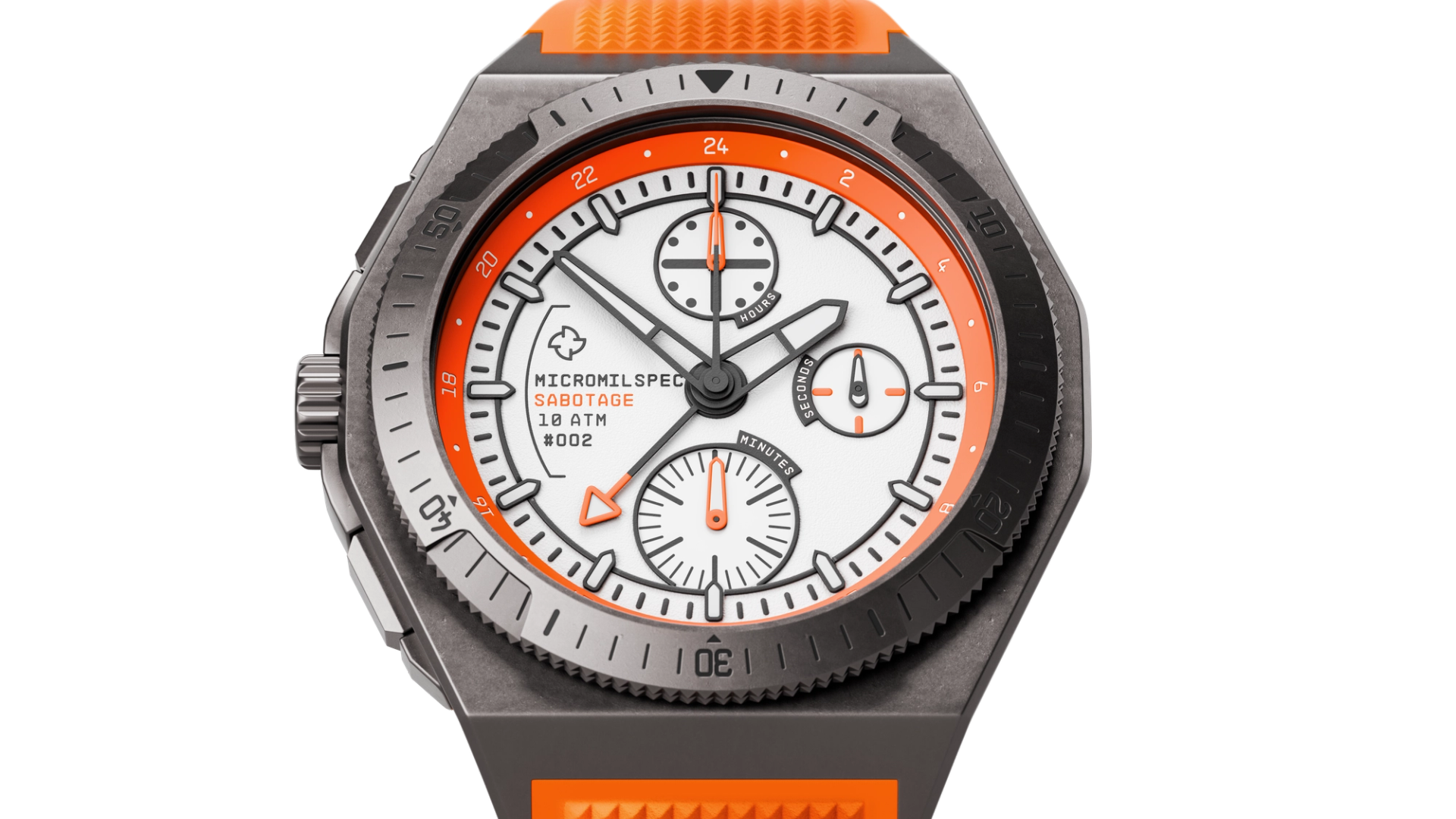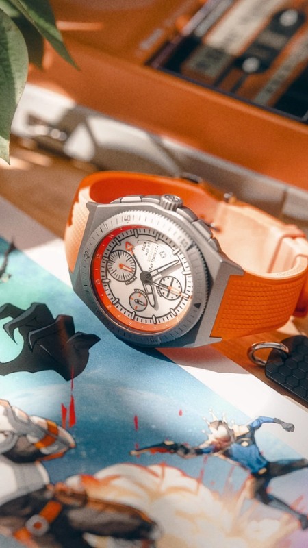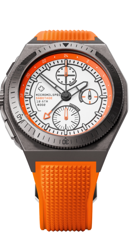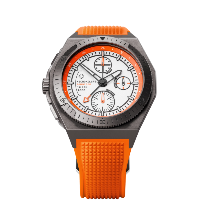 With the release comes a complete alternate anime universe, The Time Wars, where time itself is controlled by the tyrannical Chrono Syndicate, ruled by the Grand Psycho and his associate The Crown Guard. The MILGRAPH is the timepiece of choice for the galaxy’s most charming space pirate: Black Badger. Equipped with a matte white dial, Grade 5 titanium case, and a blast of high-vis orange, this watch looks like it was smuggled through a wormhole, and barely survived.