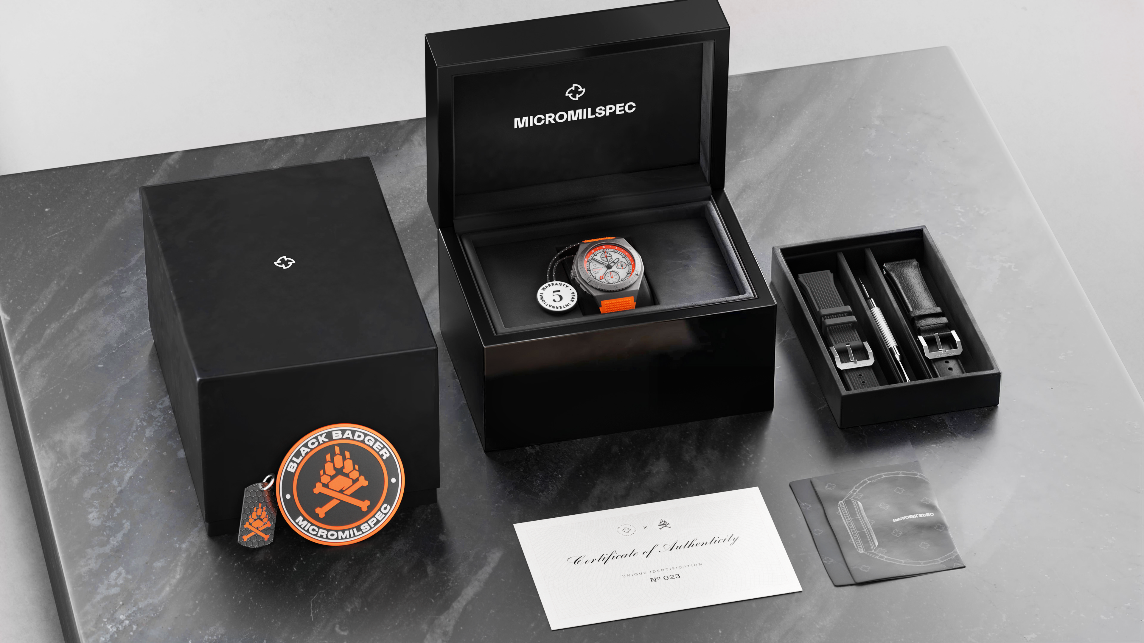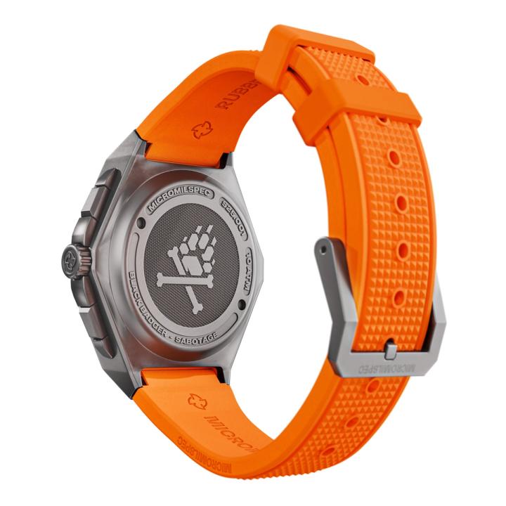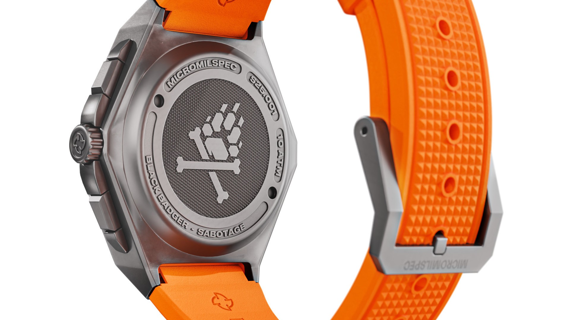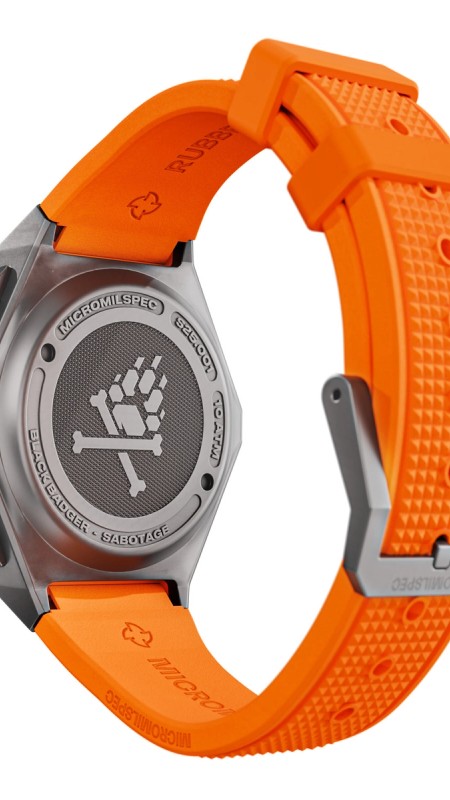 Each watch will be accompanied by a serial number-matching Zirconium and SuperLuminova dogtag in white and orange. These dogtags are co-created by Black Badger and Pat Pruitt, legendary specialist in advanced materials. Laser engraving and blowtorched oxidizing continues the Tacticool esthetic of Project Sabotage