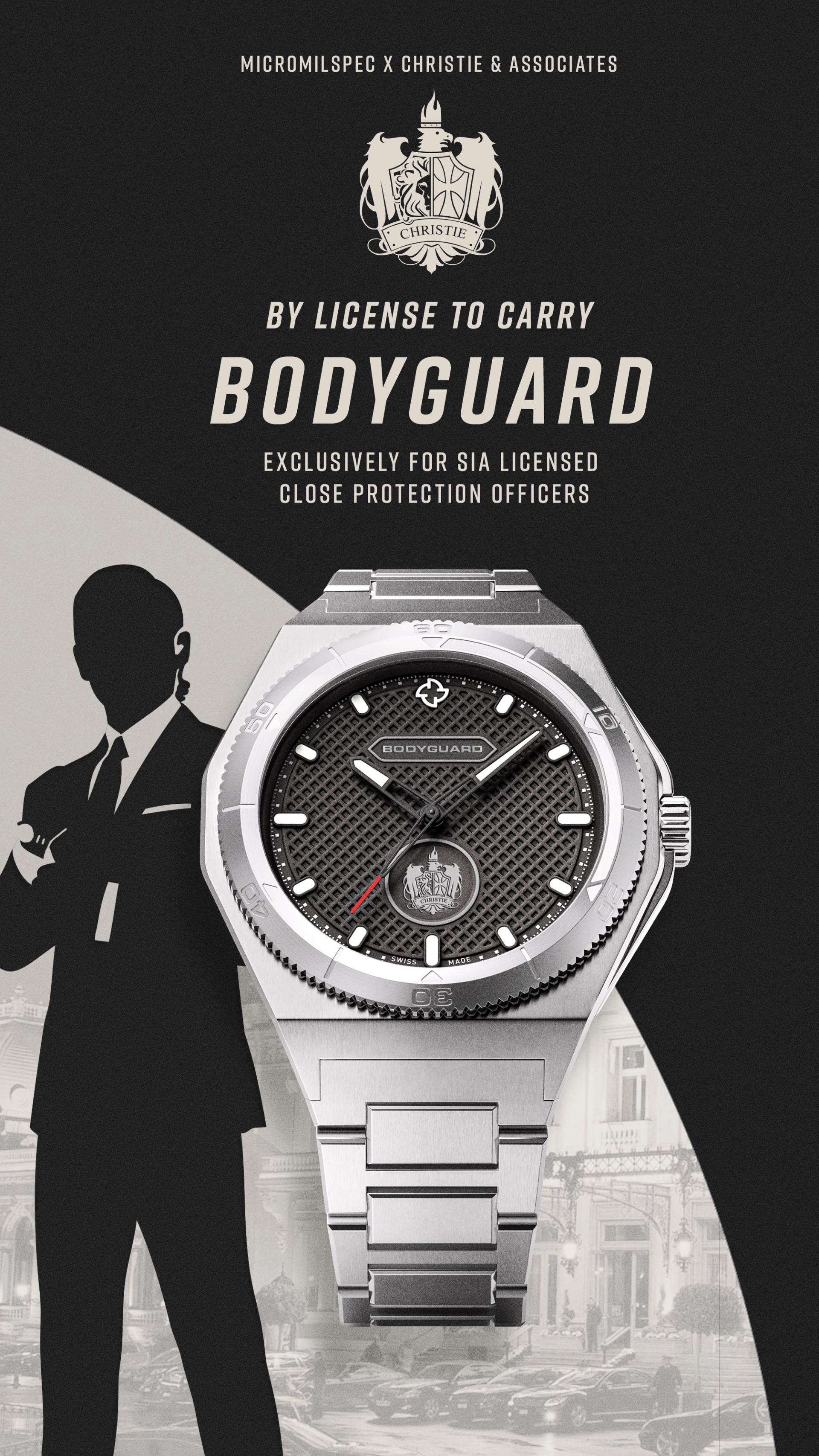 The Bodyguard by Christie & Associates is exclusively for close protection operators license holders. The Bodyguard combines tactical elements in personal timepiece. Including a diamond dial pattern inspired by the pattern of the Glock pistol grip—a nod to the tool of last resort for professionals in the field.