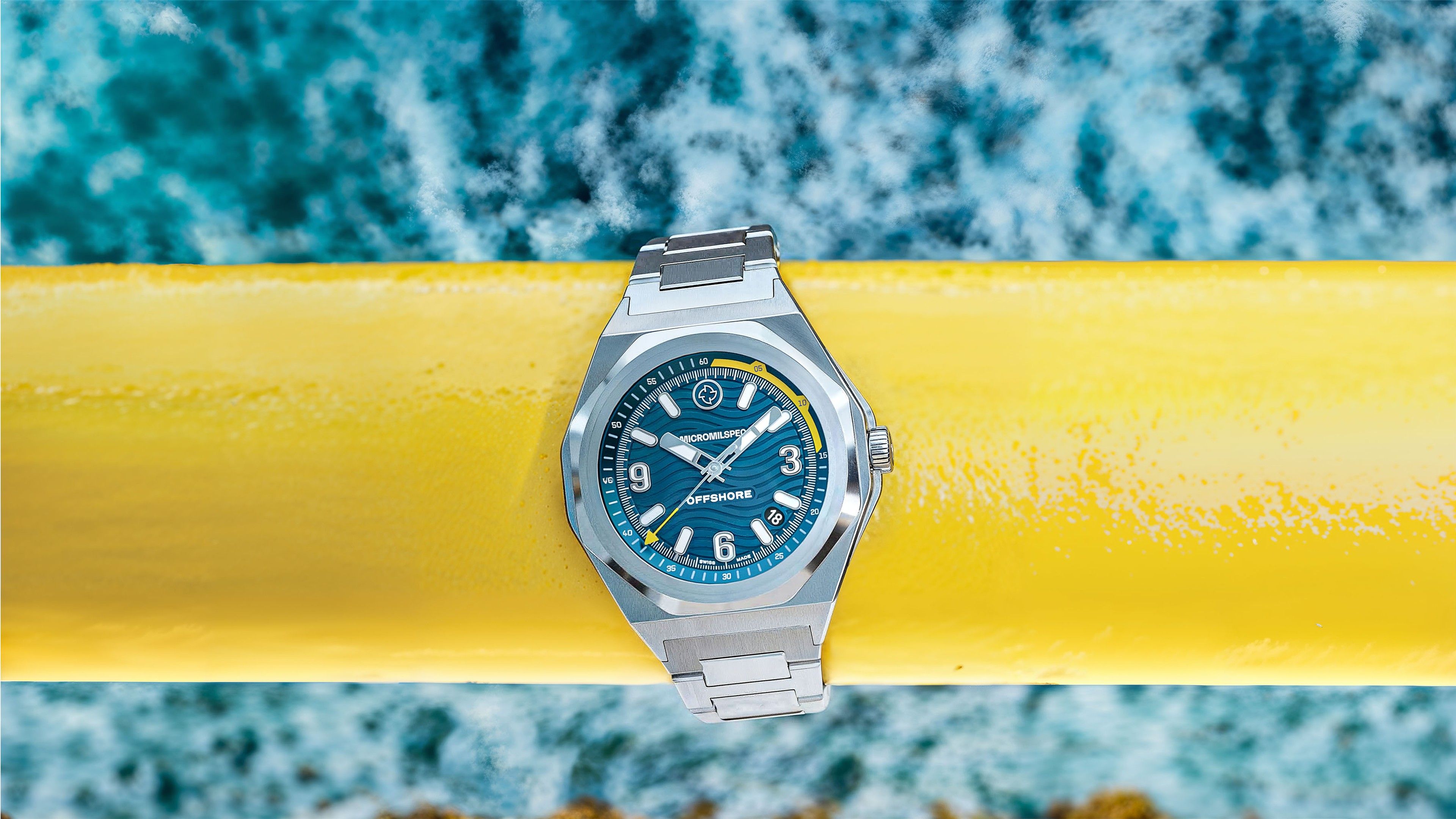 The dial features a vivid sea blue color with a wavy pattern. The color yellow, used on offshore platforms and equipment, signals caution — highlighting areas where the safety of rails and solid ground gives way to the open sea.