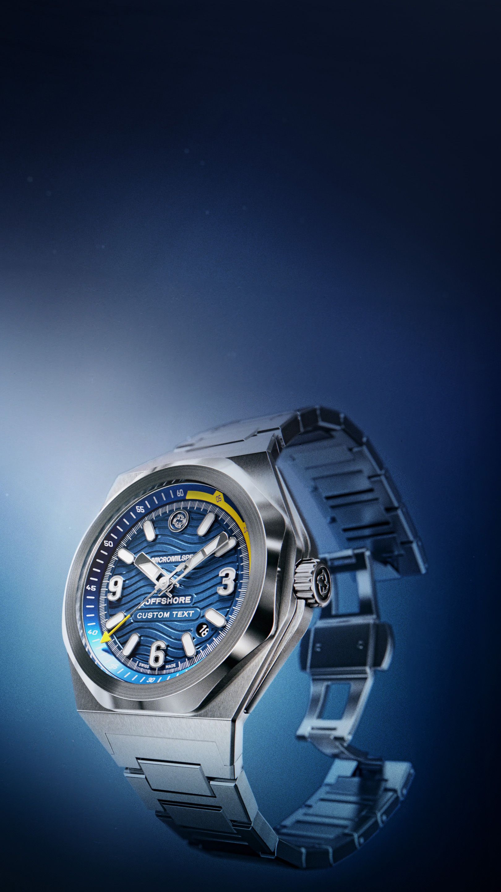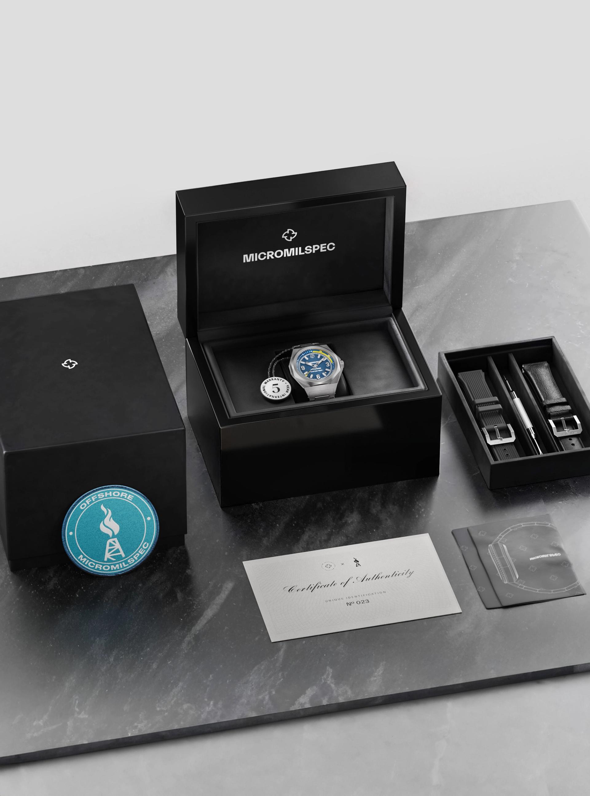 MICROMILSPEC was approached by offshore crew members from over twenty platforms, supply vessels, and floating production ships to create a timepiece that reflects their unique environment. The result is the OFFSHORE, featuring a customizable dial and caseback; a feature available exclusively to offshore crew.