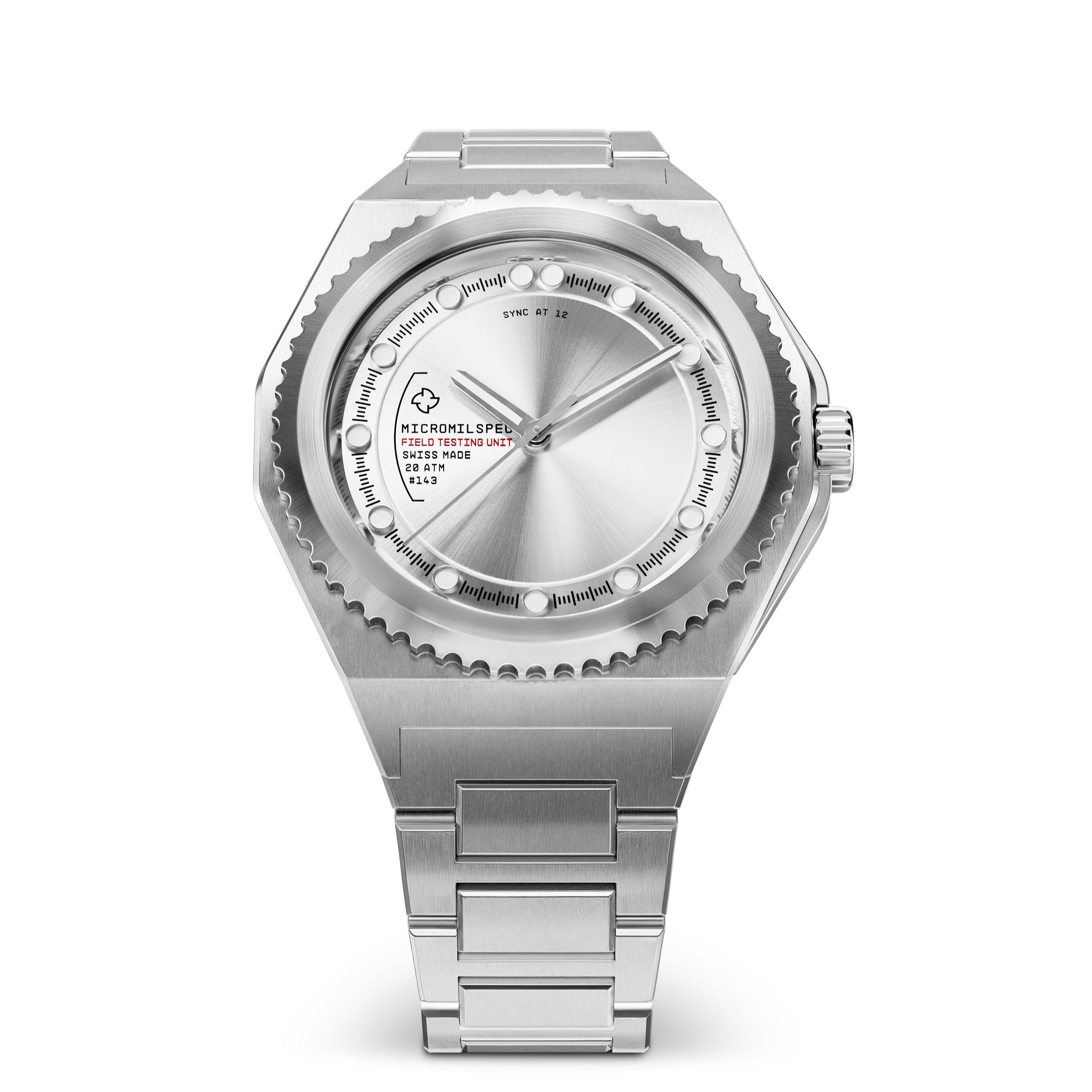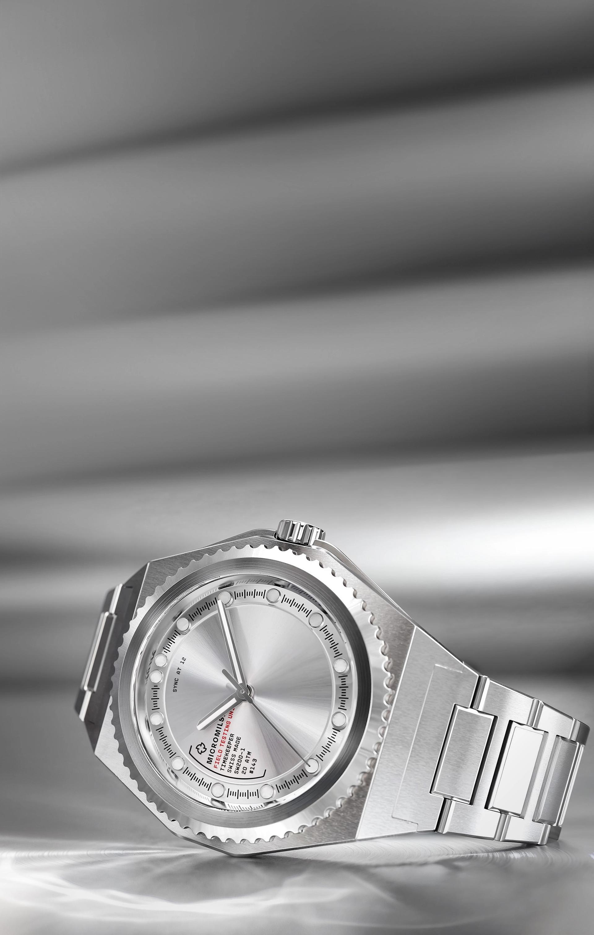The unmarked unidirectional bezel, crown, and caseback contribute to the unique look and field of the Field Testing Unit. Executed in a brushed stainless steel case, integrated straps, chamfered crown guard, screw in crown and sapphire crystal.