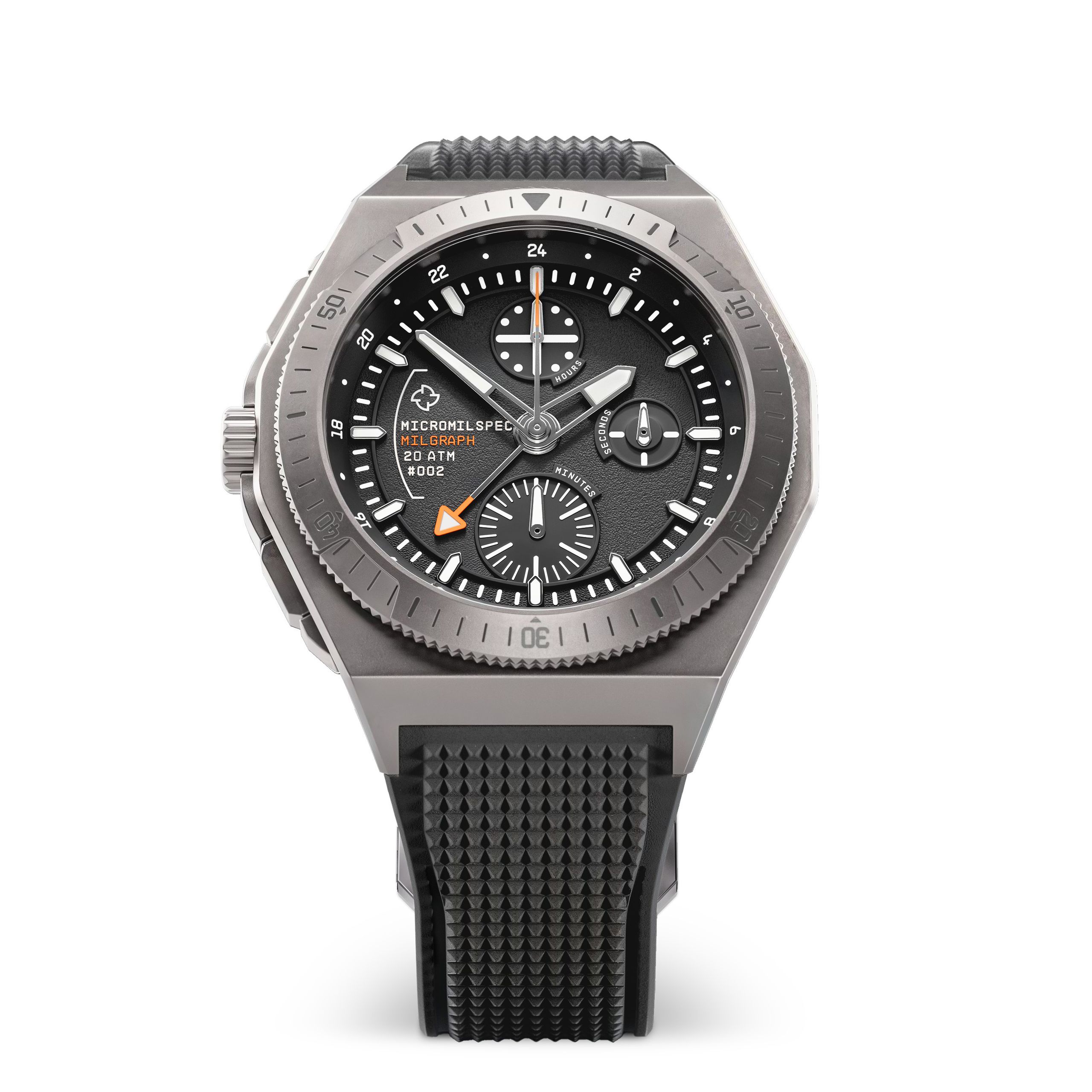 This left-hand chronograph features a swapped crown position, enhancing mobility and comfort while reducing discomfort during field and physical activities. MICROMILSPEC’s QuadGrip bezel, with its four deep indents, allows for seamless operation even when kitted up. The microblasted titanium case and red alert winding stem offer a durable, dark tactical appearance. Each chronograph sub-dial is distinctly labeled for effortless coordination