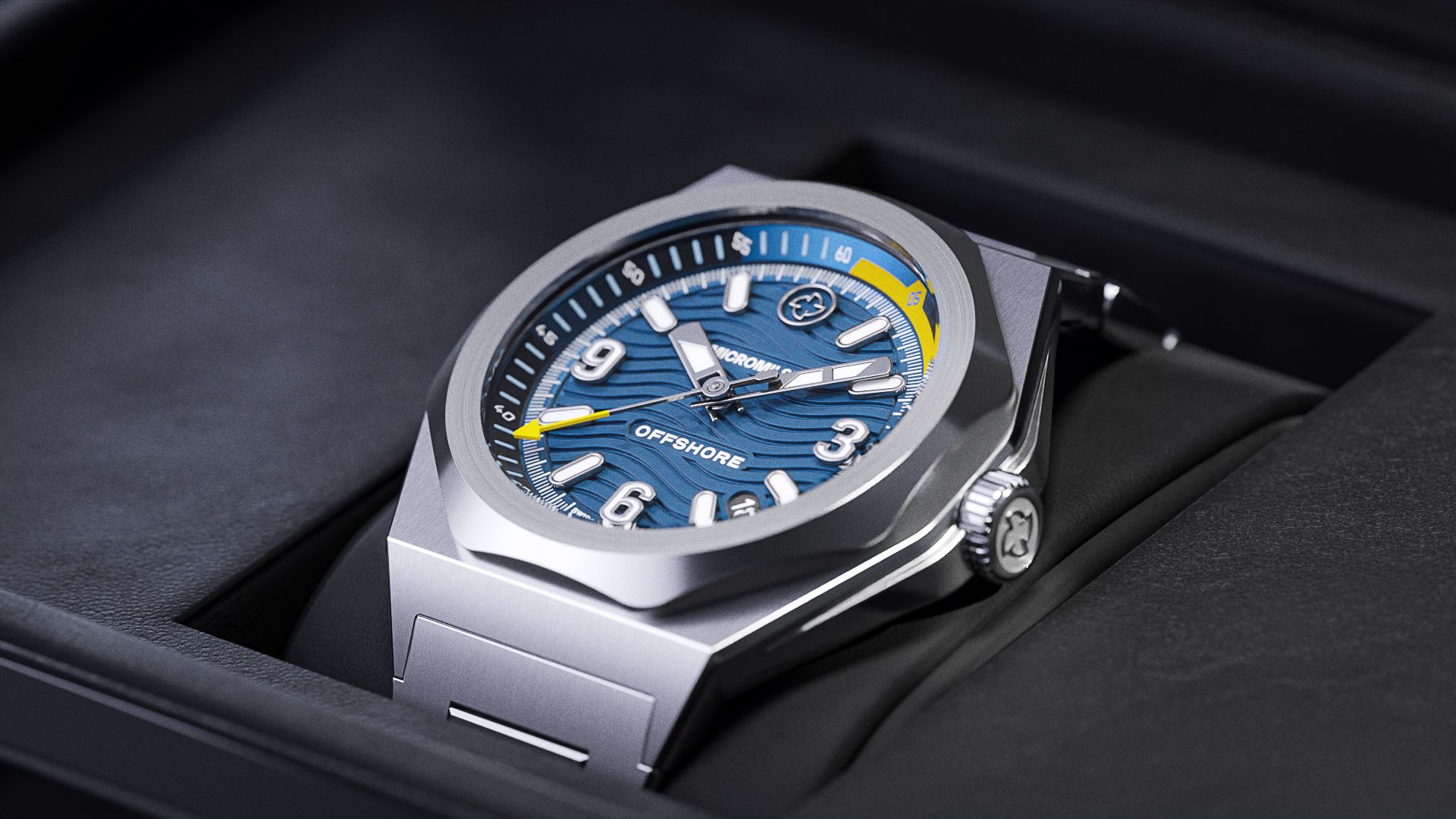 The dial features a vivid sea blue color with a wavy pattern. The color yellow, used on offshore platforms and equipment, signals caution — highlighting areas where the safety of rails and solid ground gives way to the open sea.